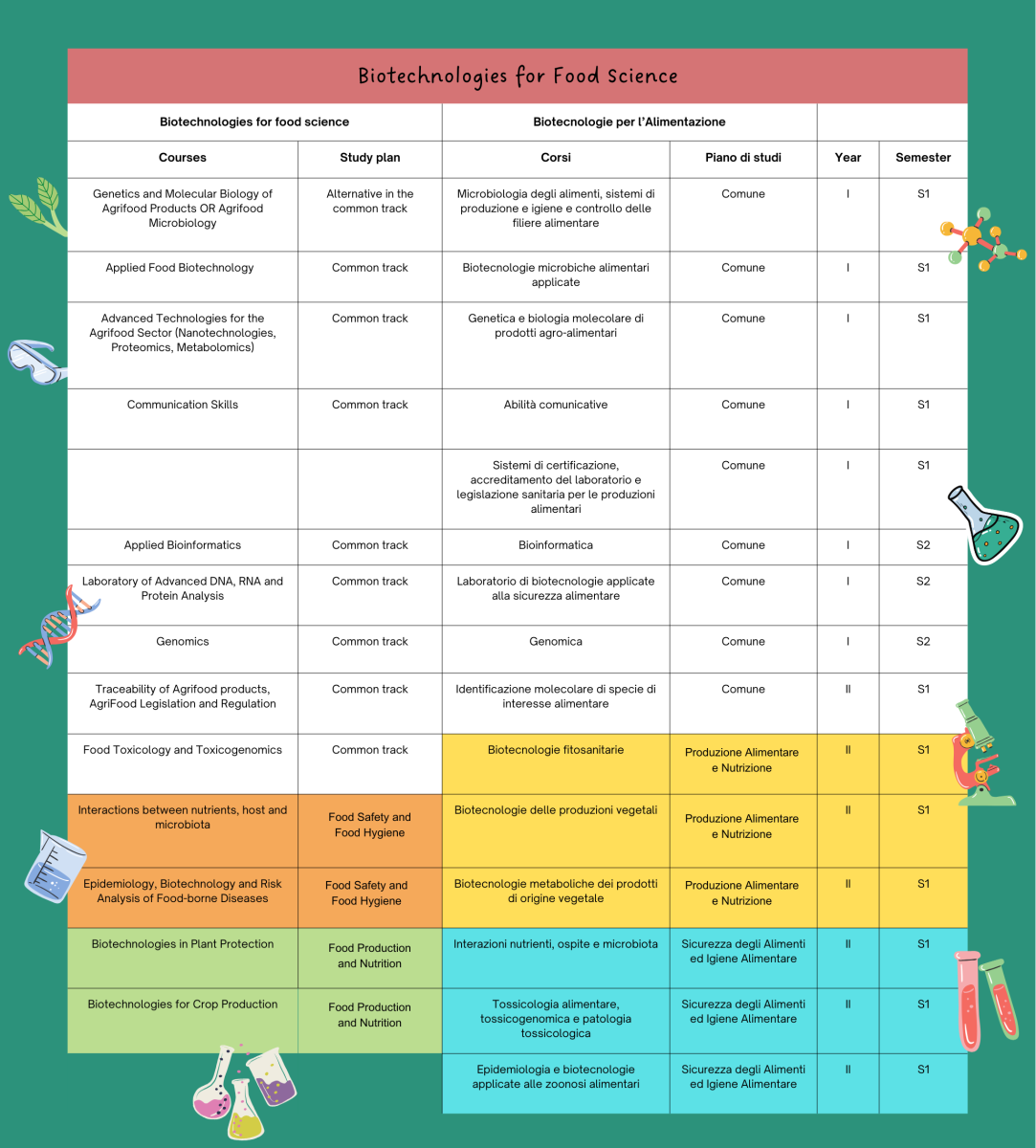 The curriculum Biotechnologies for Food Science encompasses two study plans: Food Production and Nutrition (a), and Food Safety and Food Hygiene (b). These study plans differ each other for two courses (16 credits in toto):